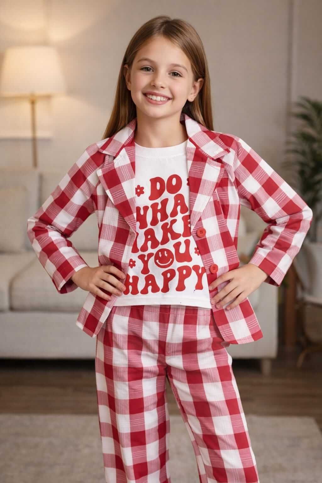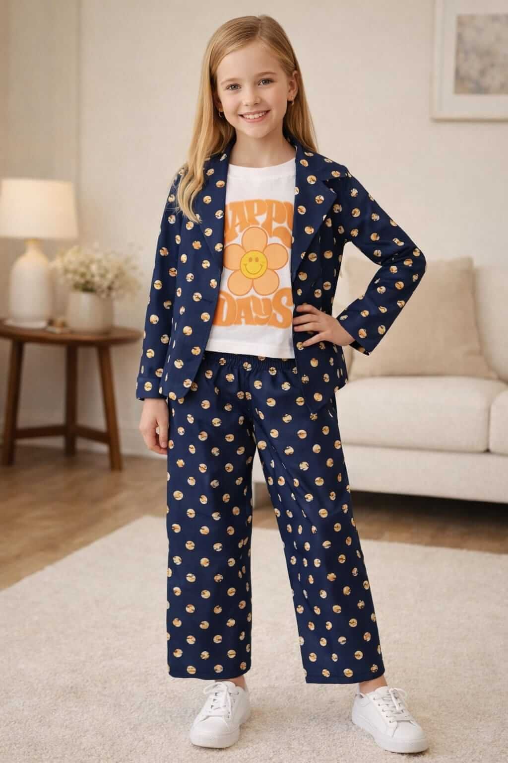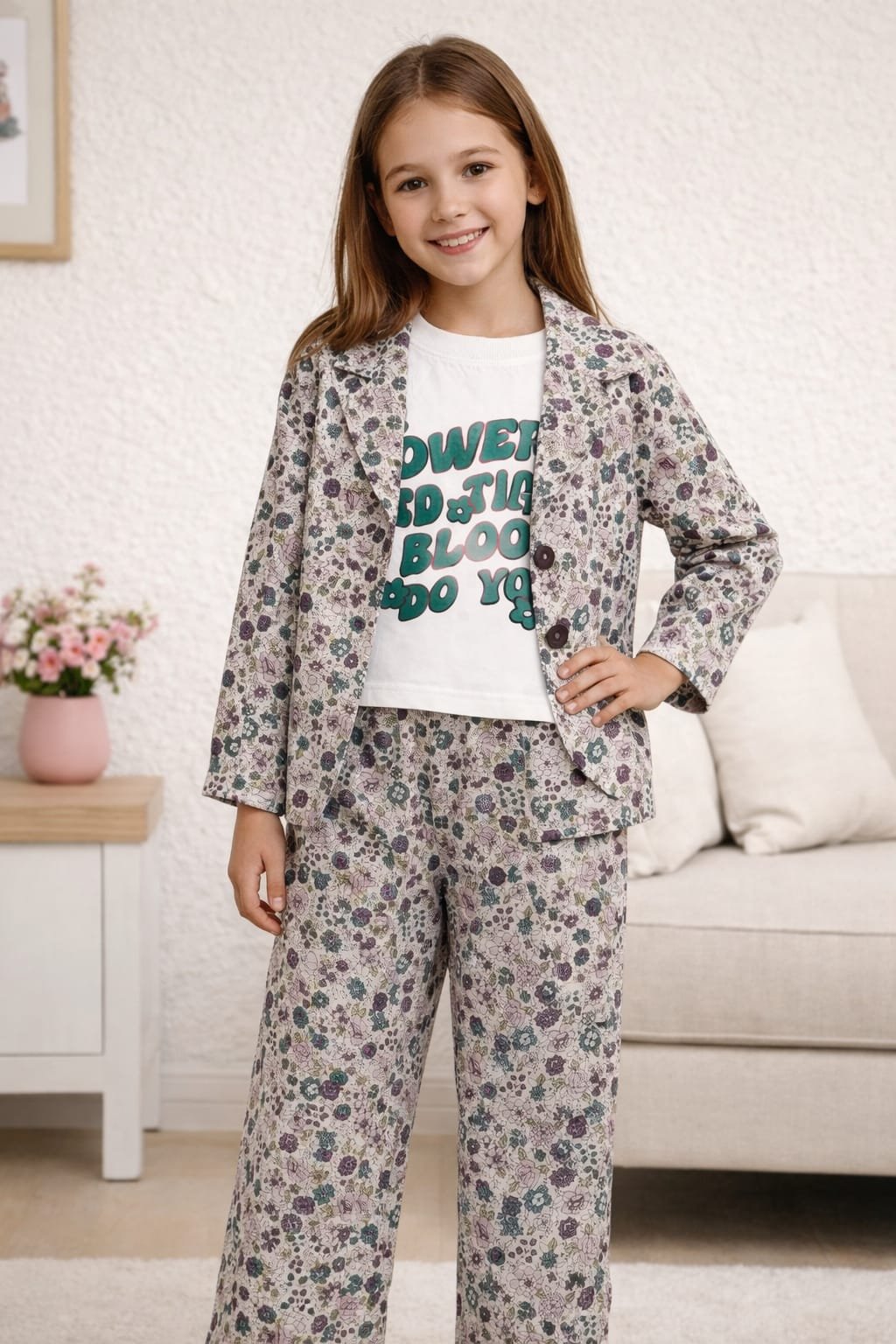 Upgrade eid dresses for girls‘ wardrobes with this beautiful floral printed 3-piece outfit set with baby coat designed for comfort and style. This trendy set includes a lightweight blazer, a soft printed T-shirt, and matching floral pants, making it perfect for casual wear, family gatherings, and special occasions.