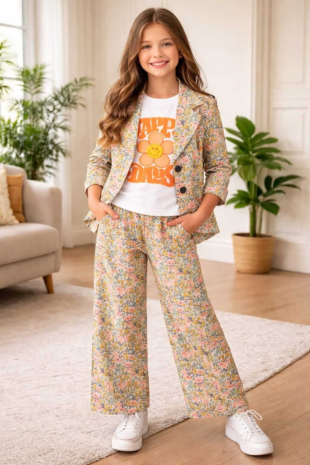 Crafted from premium breathable fabric, this outfit ensures all-day comfort while maintaining a fashionable look. The vibrant floral print adds a fresh and modern touch, making it an ideal choice for stylish young girls.